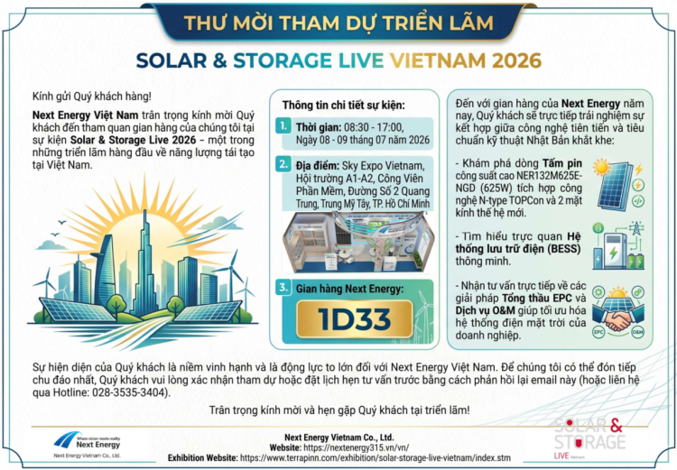Next Energy Việt Nam trân trọng kính mời Quý khách đến tham quan gian hàng của chúng tôi tại sự kiện Solar & Storage Live 2026 – một trong những triển lãm hàng đầu về năng lượng tái tạo tại Việt Nam.